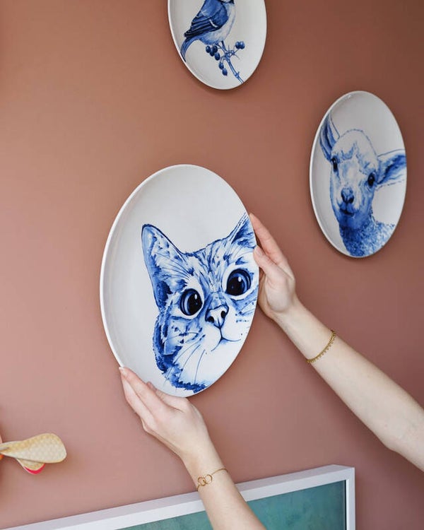 Ontwerp van Laura Graves. Een Delfts blauw wandbord met een nieuwsgierige poes die met een open blik de kamer in kijkt. Een wandbord is één van de oudste Delfts blauw producten die weer helemaal een opmars heeft gemaakt de afgelopen jaren. Deze ronde wanddecoratie van keramiek is van een hoge kwaliteit en is eenvoudig aan de muur te bevestigen dankzij een haakje aan de achterkant van het bord. Het Delfts blauwe wandbord heeft een moderne uitstraling, doordat de traditionele decoraties zoals ossenkopjes en slagblaadjes ontbreken. Het wandbord combineert hierdoor heel mooi met antieke Delfts blauwe wandborden die wel heel rijk versierd zijn. Een fantastisch leuk wandbord voor de kattenliefhebbers onder ons.
