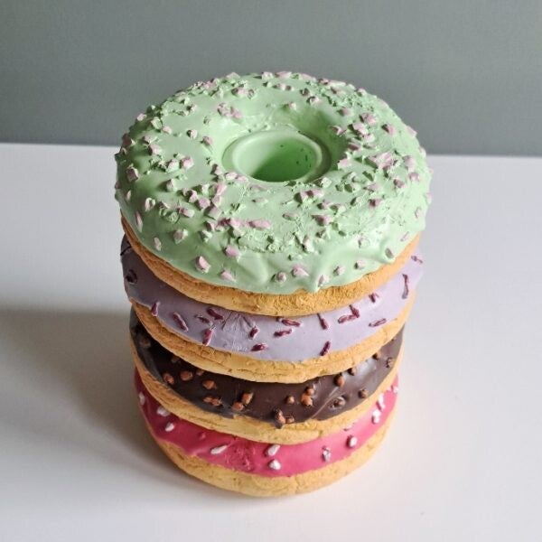 Deze kandelaar is toch gewoon te leuk?Door de matte afwerking lijkt het net echte donuts.