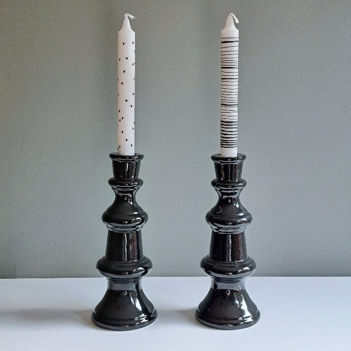 Een mooie hoogglans zwarte robuuste kandelaar in de vorm van een "schaakstuk".