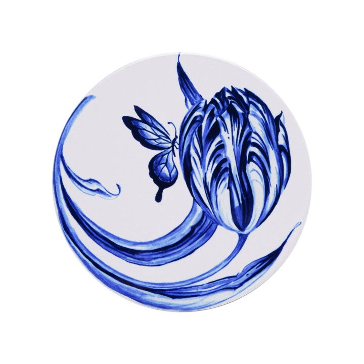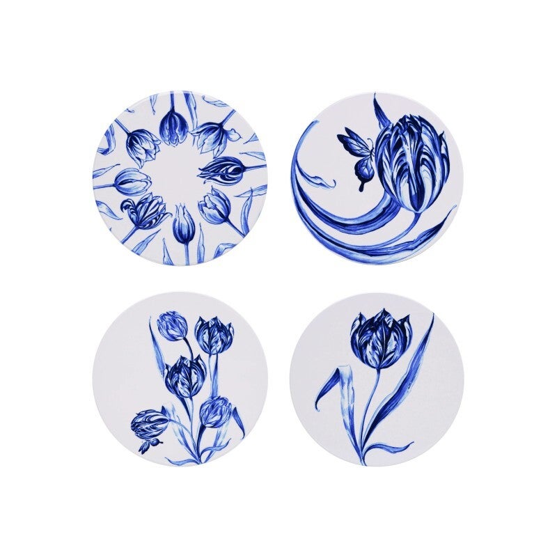 Een set van vier verschillende onderzetters voor glazen en mokken. De onderzetters zijn gemaakt van keramiek en hebben een laagje kurk aan de onderkant om ze veilig op de tafel of keukenblad te kunnen zetten. De onderzetters zijn gedecoreerd met weelderige Delfts blauwe tulpen.