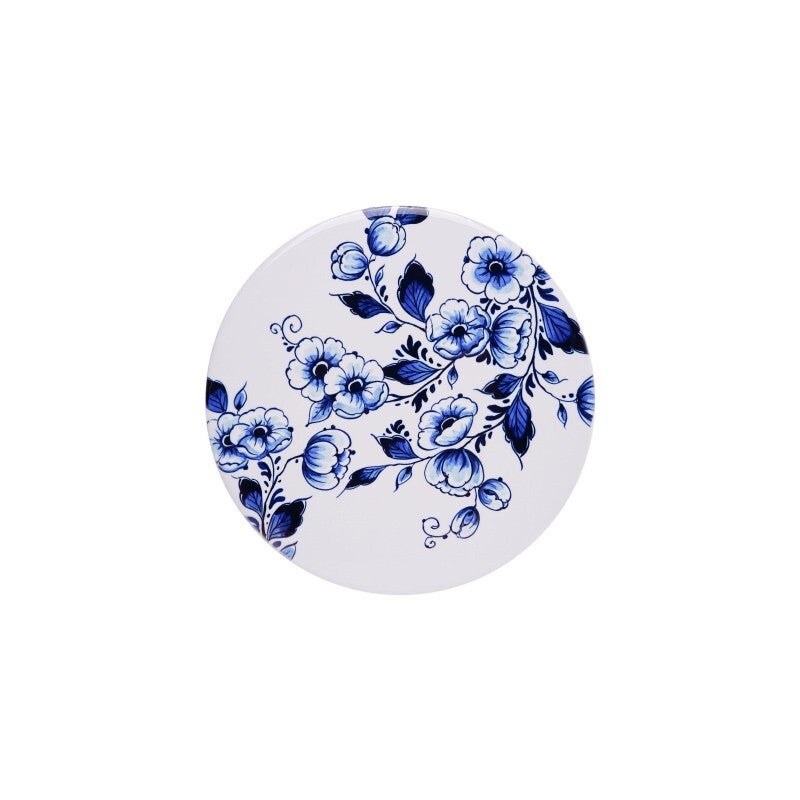 Een Delfts blauwe pannenonderzetter met Delfts blauwe bloemen erop. Deze onderzetter voor pannen is gemaakt van keramiek en heeft aan de onderkant een laagje kurk om hem veilig op de tafel of keukenblad te zetten. Deze onderzetter voor hete pannen is een leuk aandenken aan je tijd in Nederland of is een leuk cadeau voor iemand in het buitenland die een connectie met Nederland heeft. Uiteraard hoort de decoratieve pannenonderzetter ook thuis in de Nederlandse keuken.