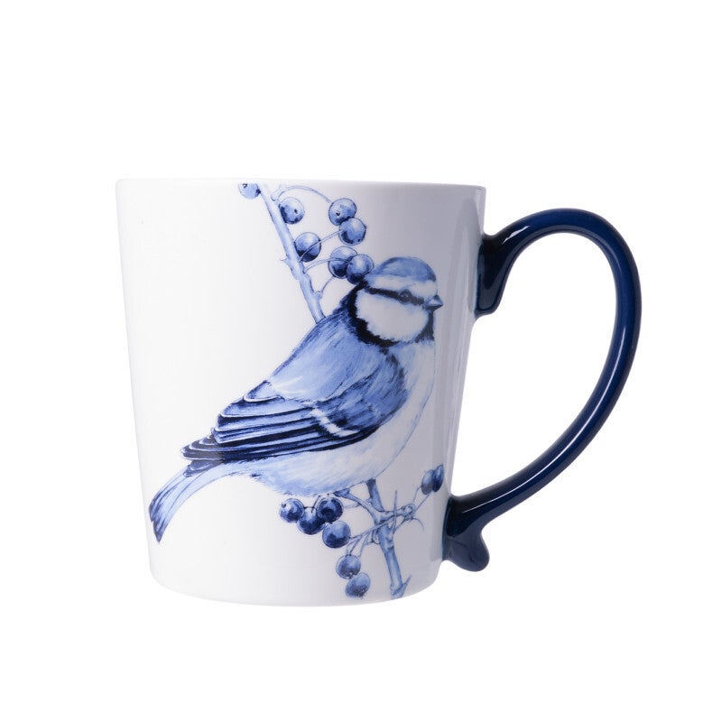 Een Delfts blauwe mok met oor, met daarop een geschilderde pimpelmees die uitrust op een takje. Of naja, uitrusten… De pimpelmees staat wel bekend om zijn acrobatische gedrag, waarbij het energieke vogeltje in alle (on)mogelijke posities naar voedsel zoekt. Of dat nou ondersteboven bungelend aan een takje is of vastgeplakt aan de muur! De pientere kleine oogjes staan altijd op scherp, maar zijn gezang wordt omschreven als een zilveren lachje. Een Nederlands bosvogeltje om te koesteren.