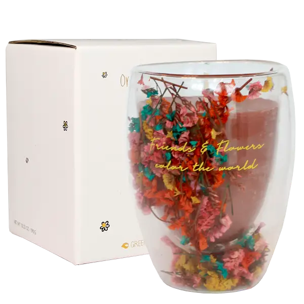 Deze luxe geurkaarsen hebben een dubbele wand waar gedroogde bloemetjes tussen zitten. Een èchte eyecatcher! Deze kaars ziet er niet alleen leuk uit, als de kaars is opgebrand, kan je het glas gebruiken als theeglas of een andere heet of koud drankje. Door de dubbele wand zorgt het glas ervoor dat je drankje warm blijft, zonder dat je handen ook heet worden.