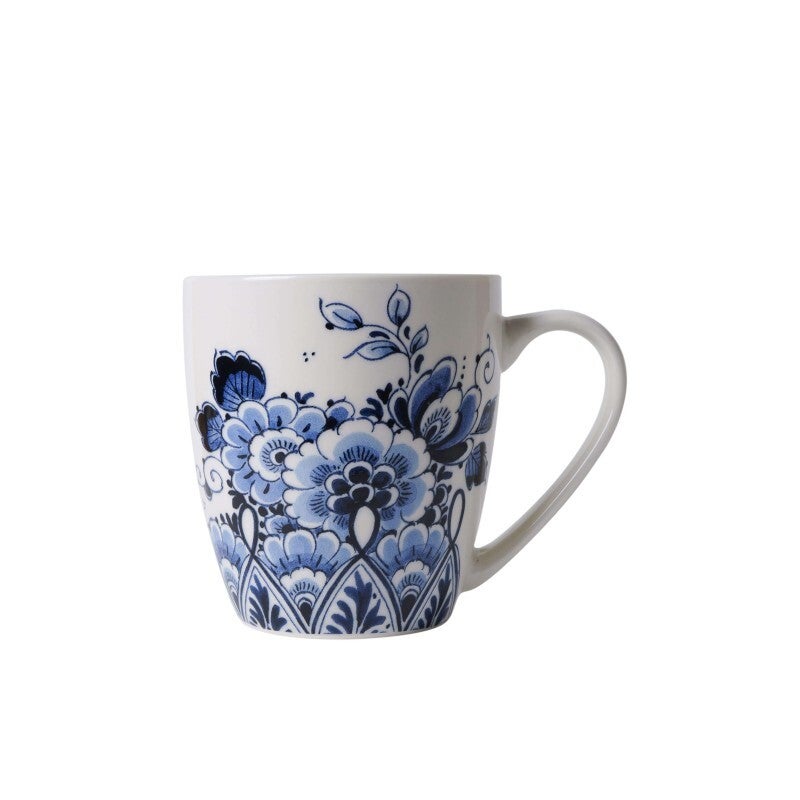 Een leuke, Delfts blauwe mok met een mooie zee van bloemen. De stevige mok ligt fijn in de hand dankzij de licht bolle vorm en het grote handvat. De mok is rondom gedecoreerd met een traditioneel Delfts blauw bloemenpatroon. Bloemen en stillevens zijn één van de eerste decoraties die op Delfts aardewerk gebruikt werden en zijn door de eeuwen heen altijd geliefd gebleven. Deze Delfts blauwe mok is daarom zowel klassiek als tijdloos en een leuke aanwinst voor in de keuken of op de koffietafel.